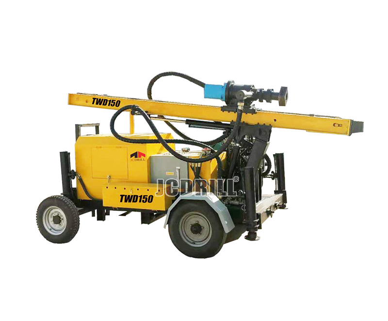 يمكن لجهاز الحفر المثبت على مقطورة TWD150 الحفر في جميع أنواع التكوينات باستخدام الحفر بالطين في التكوينات الناعمة والمطرقة DTH بالهواء في الحفر الصخري، حيث تُستخدم المطرقة DTH في الحفر الصخري، ويتم تفريغ الخبث بواسطة ضغط الهواء، وكفاءة المرحلة الخارجية أعلى بعشر مرات من الحفر الدوار التقليدي.